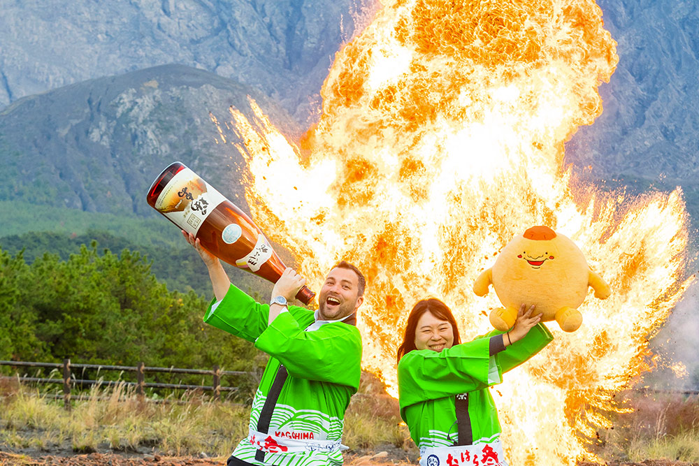 雄大な桜島を眺めながら思い思いのコスチュームで記念写真や動画を撮影できます。その臨場感、迫力はものすごく、まるでドラマの主人公になったよう。一部には世界初・桜島の火山灰を含んだ爆破体験を入れています。