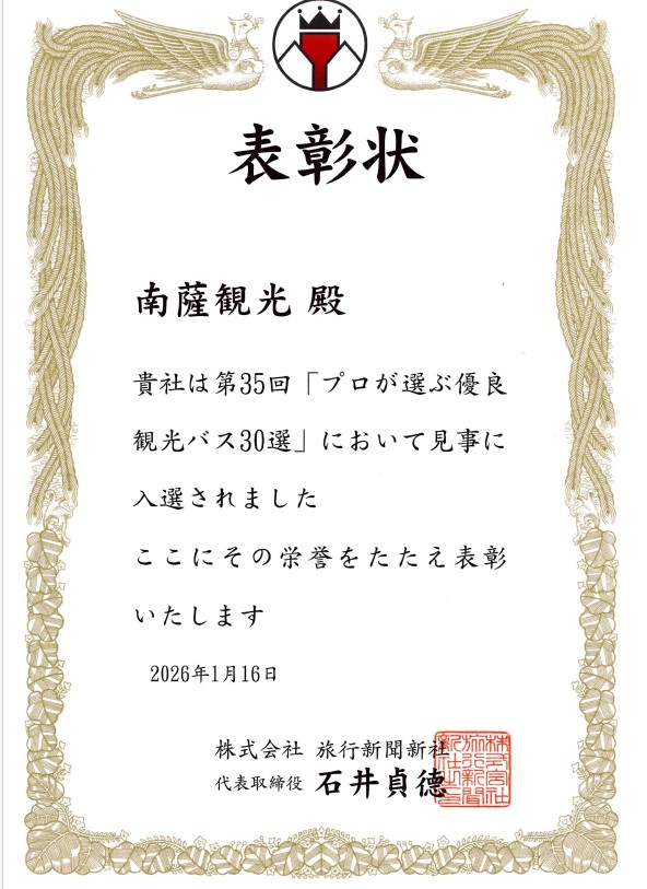 2024年度「貸切バス事業者安全性評価認定制度」三ツ星認定(継続)されました。この度、南薩観光株式会社は、公益社団法人日本バス協会より「貸切バス事業者安定性評価制度」3つ星認定… |