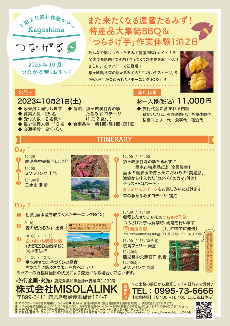 ※ このツアーに係る体験費用は、つながる❤️(おもい)農村体験事業(鹿児島県農政部農村振興課)より助成金が出ております。