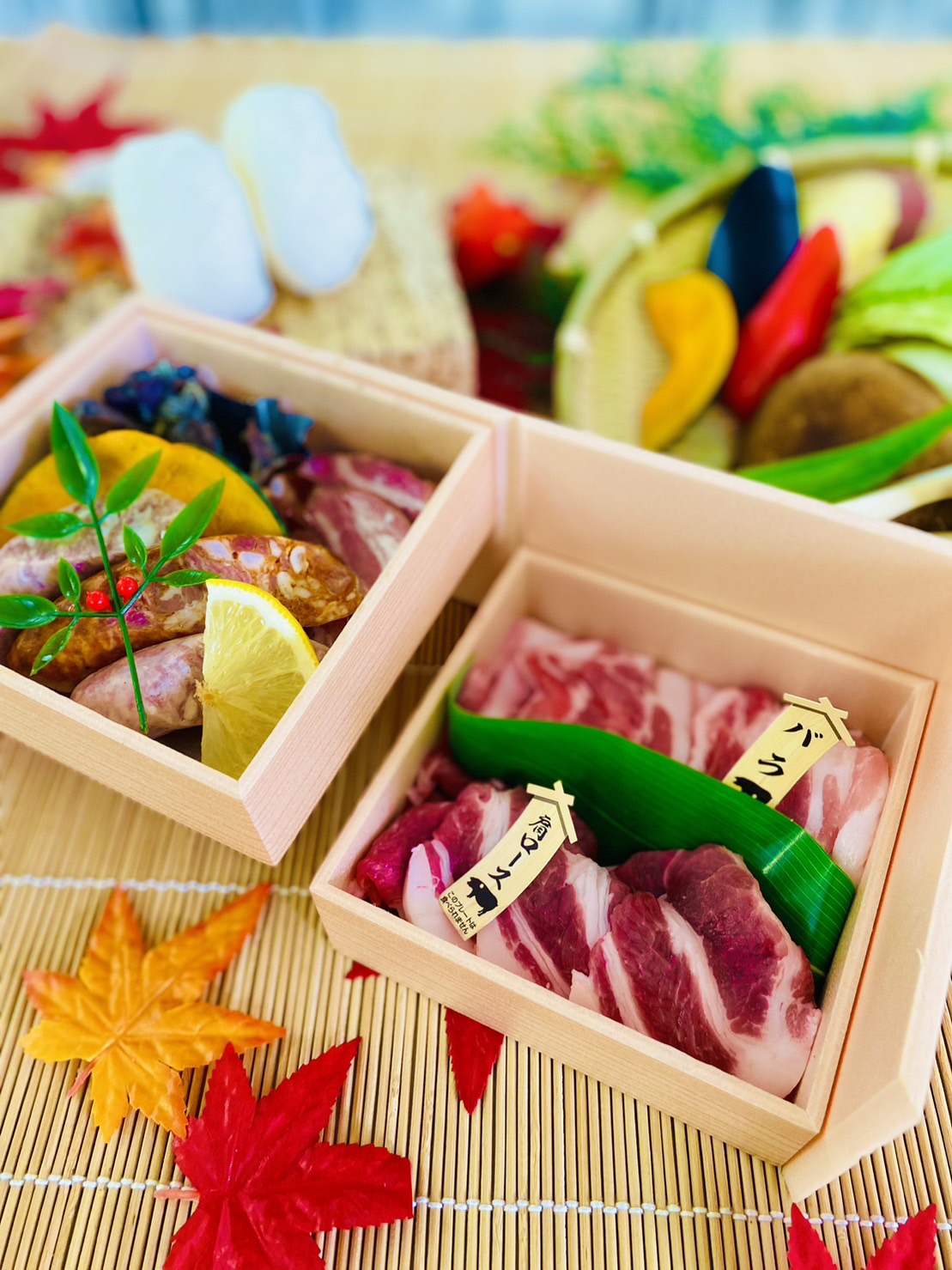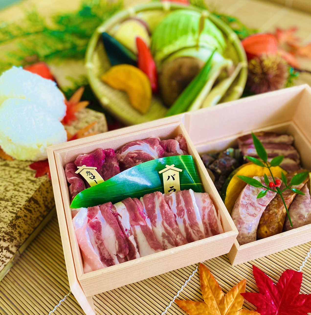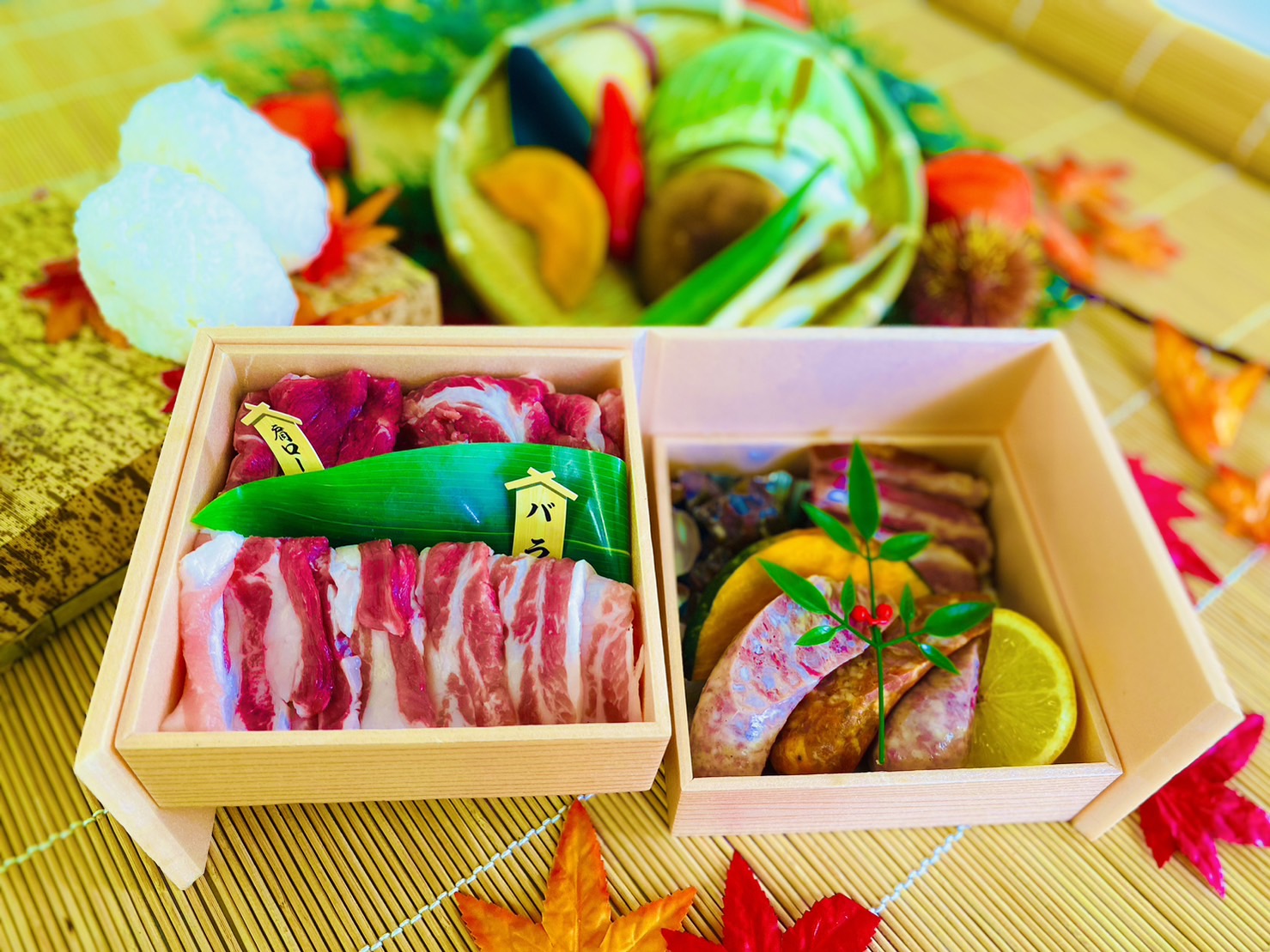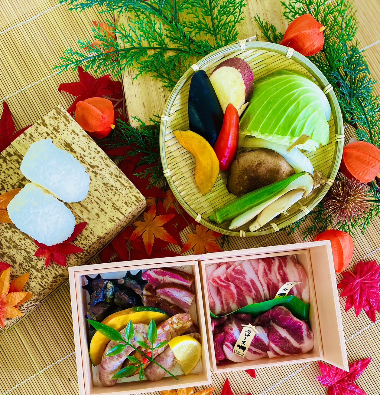 焼肉のたれ、スパイス(小袋)、おにぎり2ヶ、季節の野菜盛り
