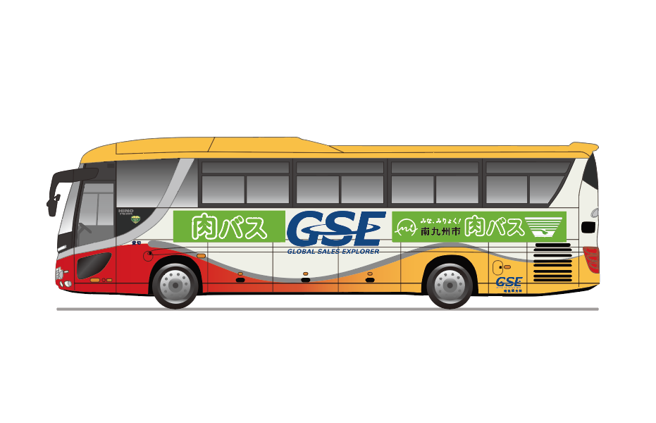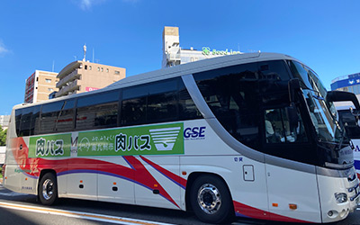 「肉バスツアー」の名のとおり、肉バスデザインのラッピングバスにて運行いたします♪